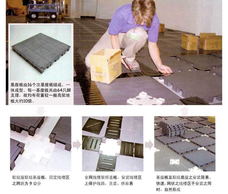 一般人對(duì)塑橡膠材質(zhì)制造之基座板使用壽命較短之主觀印象是錯(cuò)誤的。本產(chǎn)品之使用壽命較傳統(tǒng)合金鋼高架地板長(zhǎng),更沒(méi)有傳統(tǒng)合金鋼高架地板之缺點(diǎn)。本產(chǎn)品安裝方式不污染,不破壞地臺(tái)。