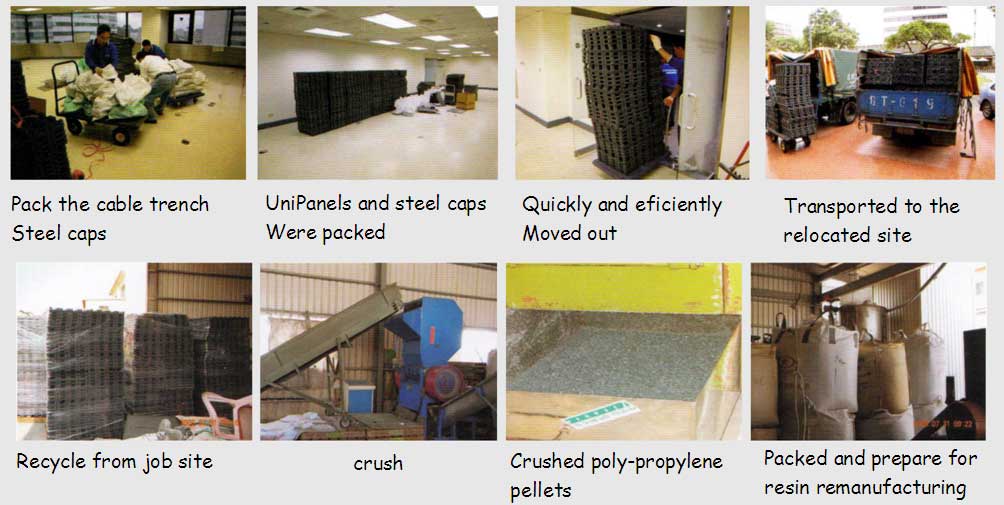9-3:回收再生:本網(wǎng)絡(luò)地板之所有主元件,包括基座板、中央蓋板、邊蓋板、連接底座、斜坡、鋁壓條等,如不重新使用,100%可回收再生。
